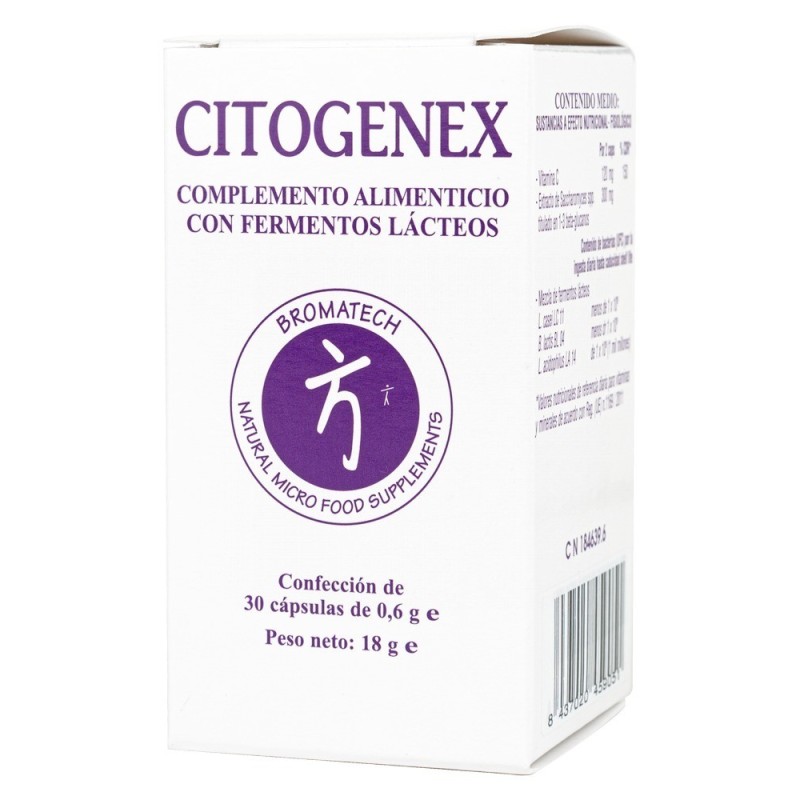 Citogenex es un probiótico del laboratorio Bromatech, que en su formulación, además de cepas bacterianas, contiene β-glucanos, que mejoran la función de la barrera intestinal y modulan la respuesta del sistema inmunitario. Se diferencia del Aflugenex por contener cepas como el L. Casei en lugar del L. Paracasei.